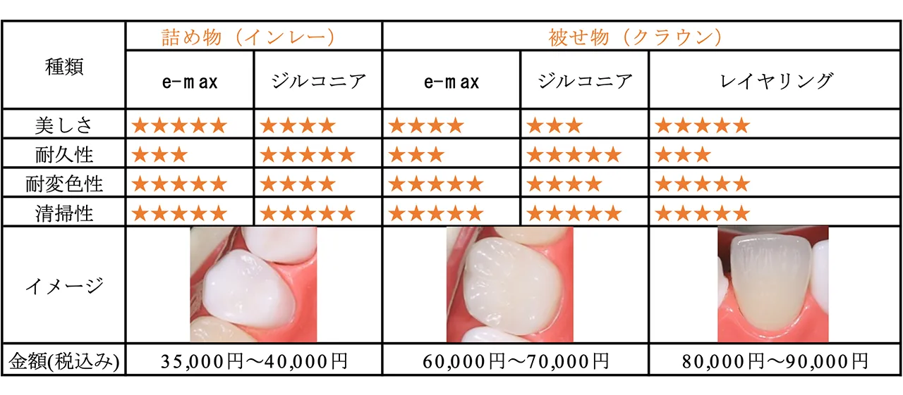 | 治療のリスク | ・金属の詰め物より歯を削る量が増える場合がある (強度確保のため) ・歯髄(歯の神経)の治療が必要になることがある |
